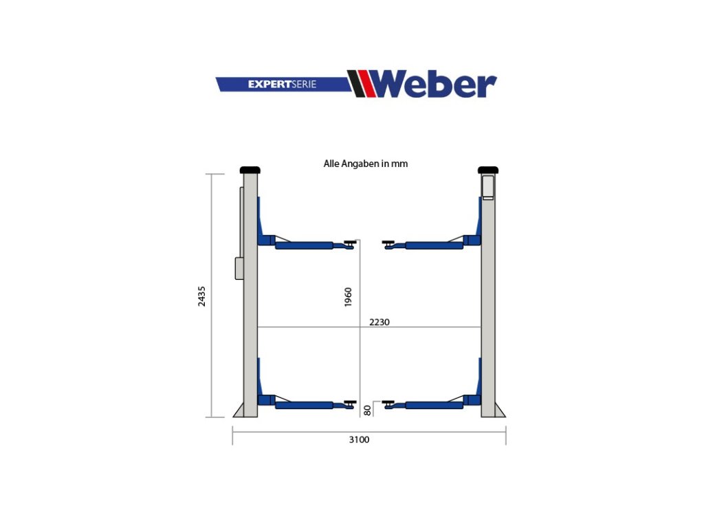 Technické parametre Nosnosť 3200 kg Výška zdvihu max. 1960 mmVýška stĺpu 2435 mm Požadovaná výška miestnosti 2600 mm Vzdialenosť medzi stĺpmi 2510–2710 mmŠírka priechodu 2230–2430 mmInštalačná šírka 3100–3300 mm Dĺžka dlhého ramena 940–1275 mm Krátka Dĺžka krátkeho ramena 520–900 mmElektrické pripojenie 400 V / 3 Ph / 50 HzVýkon motora 2 x 2,2 kWDoba zdvihu 45 s. |