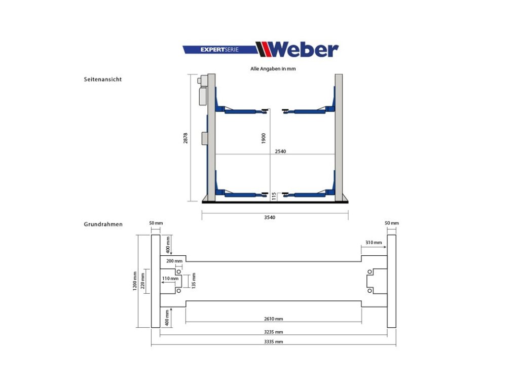 2-stĺpový zdvihák 4.0G série Weber Expert je možné vďaka stabilnému základnému rámu namontovať aj na betónové podlahy s minimálnou hrúbkou 150 mm.