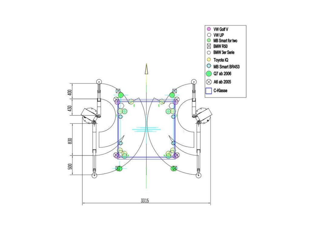 Parameter Hodnota Nosnosť: 3 000 kg Výška zdvihu: cca 2005 mm Čas zdvihu/spustenia: cca 50 sek. Spodná výška (pri spustení): cca 85 mm Krátke podperné ramená (3-dielne): 430 - 830 mm Dlhé podperné ramená (2-dielne): 830 - 1340 mm Inštalačná šírka: 3315 mm Výška stĺpa: 2550 mm Celková výška: 4025 mm Vnútorný rozostup stĺpov: 2650 mm Voľná priechodná šírka: 2320 mm Napájanie: 400 V Výkon pohonu:2x 2,5 kW Istič: 20 A Hĺbka základu 21 cm (C20/25) Farba RAL 9005 |
