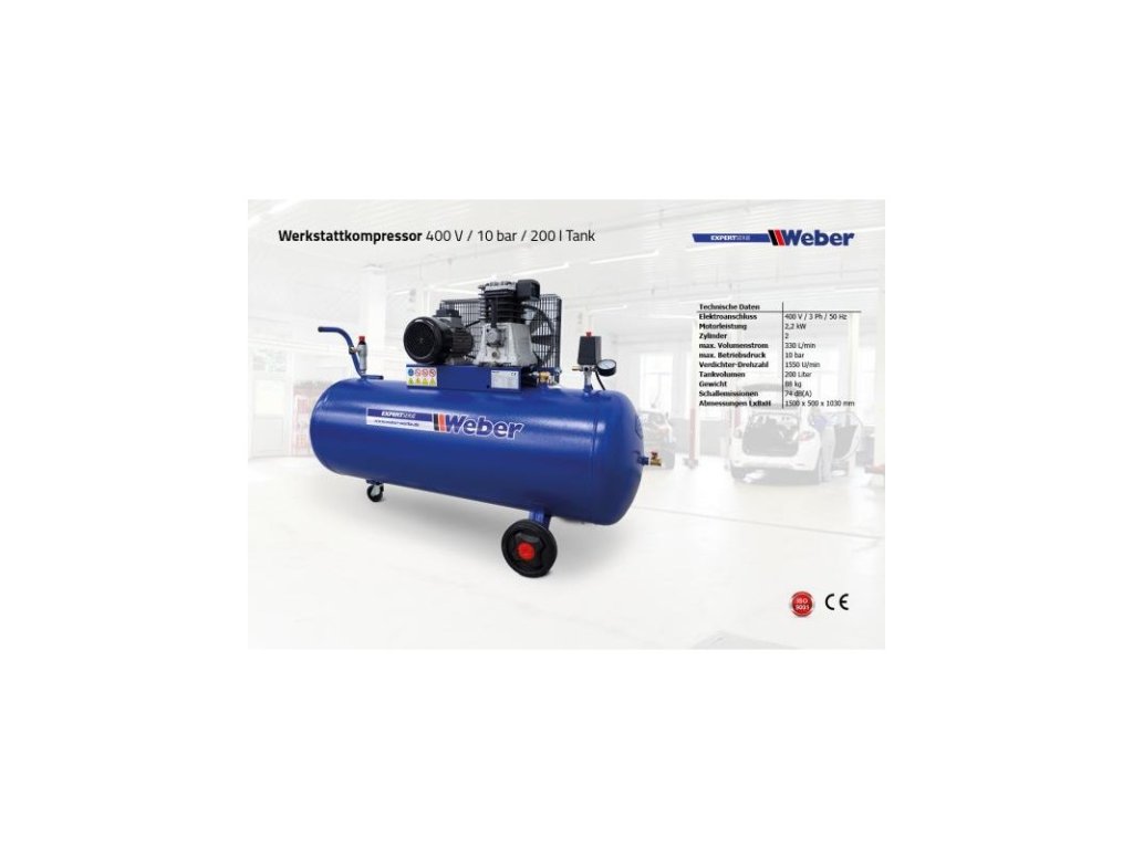Parameter Hodnota Výkon motora 3 kW Elektrické pripojenie 400 V / 3 fázy / 50 Hz Max. prevádzkový tlak 10 bar Počet valcov 2 Otáčky kompresora 1200 ot./min Objem nádrže 200 litrov Hlučnosť 97 dB(A) Rozmery (D × Š × V) 1320 × 490 × 1050 mm Max. prietok vzduchu 400 l/min Hmotnosť 105 kg Otáčky motora 2850 ot./min Nasávací výkon 480 l/min -