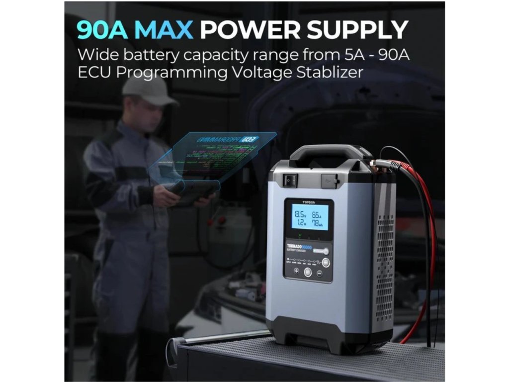 TOPDON Tornado90000 – špičková chytrá nabíječka navržená pro profesionální a komerční použití. Podporuje 12V i 24V olověné akumulátory s kapacitou od 5 do 90 Ah. Tornado90000 nabízí flexibilní nastavení proudu a napětí a chrání baterie prostřednictvím 9krokového inteligentního nabíjení a 6 programovatelných režimů nabíjení. Funkce SUPPLY Mode poskytuje stabilní DC výstup a umožňuje použití zařízení jako programovacího stabilizátoru napětí pro ECU.