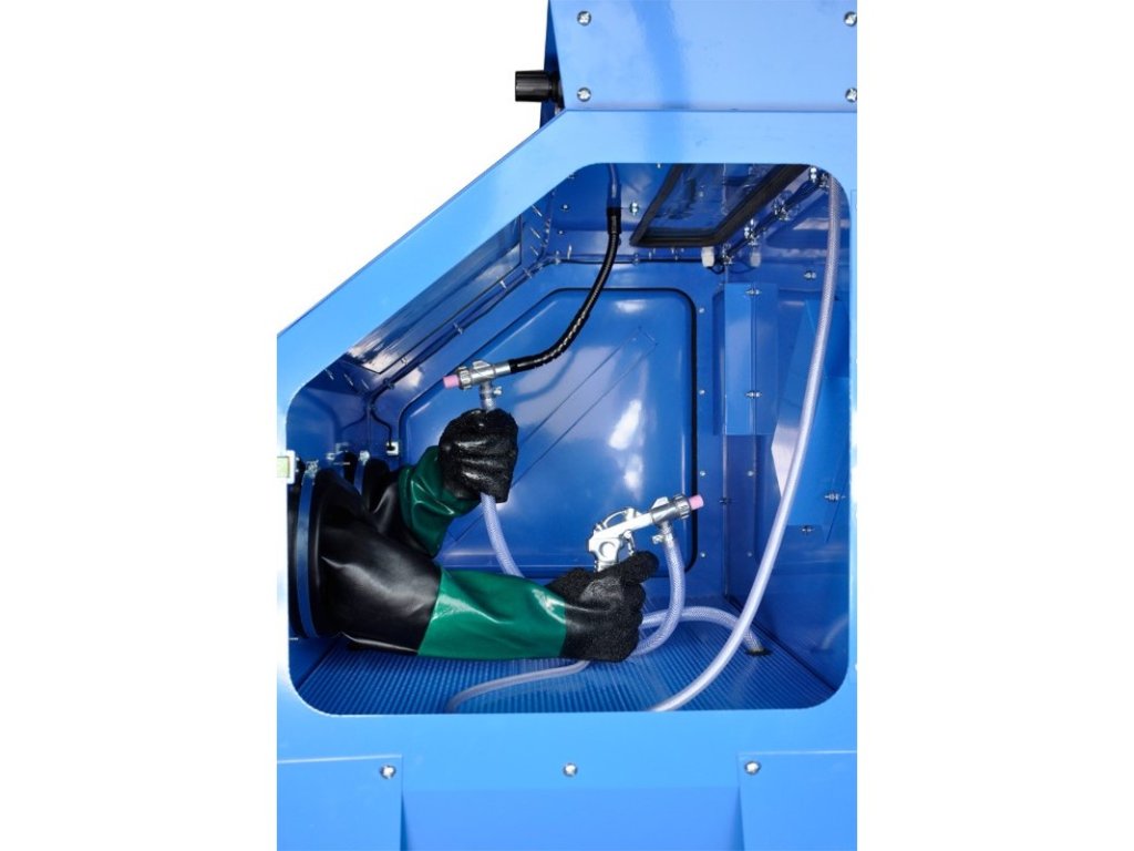 2x veľké, integrované pracovné rukavice, 2x neónová lampa 20 Watt, 1x prípojka 220V, 1x sacia s filtračná vložka, 2x výfukové porty pre pripojenie výfukových systémov pre nečistoty a bezprašnú prácu, 1x pieskovacia pištoľ so vzduchovou hadicou, 1x injekčná pištoľ s keramickou tryskou, 1x regulátor tlaku a tlakomer, 4x vyberateľné keramické trysky pre pieskovacú pištoľ pištole 4 mm, 5 mm, 6 mm, 7 mm, 3x veľká ochranná fólia, 3x malá ochranná fólia, 1x pedál pre ovládanie nohou, 1x mriežka, 1x tesniace hmoty (lepidlo, teflónová páska)