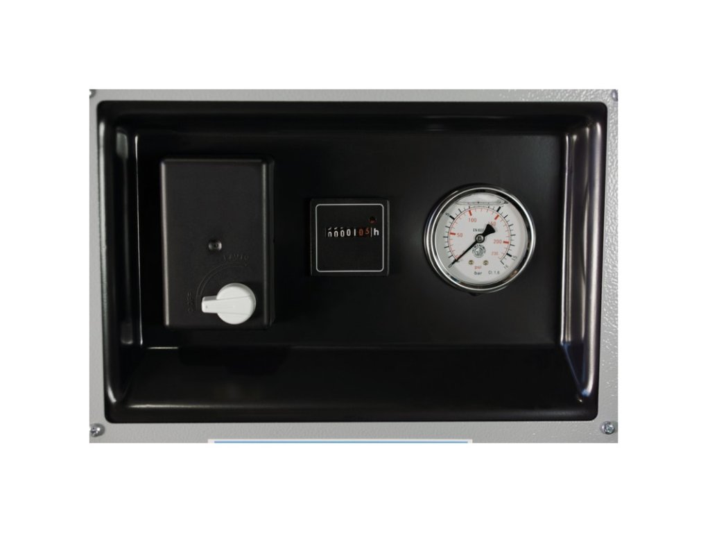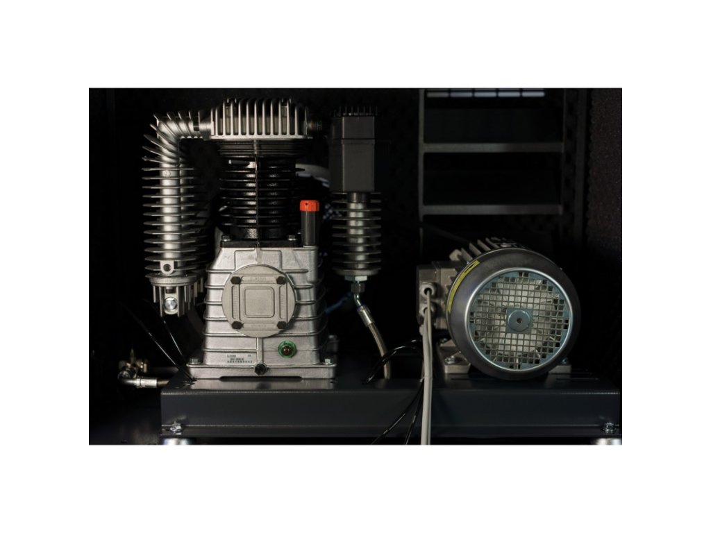 Priestorovo úsporný, super tichý 2-valcový kompresor, ovládaný klinovým remeňom, tichý, olejom mazaný dizajn.
