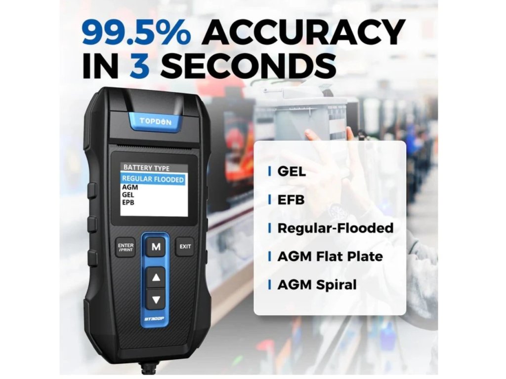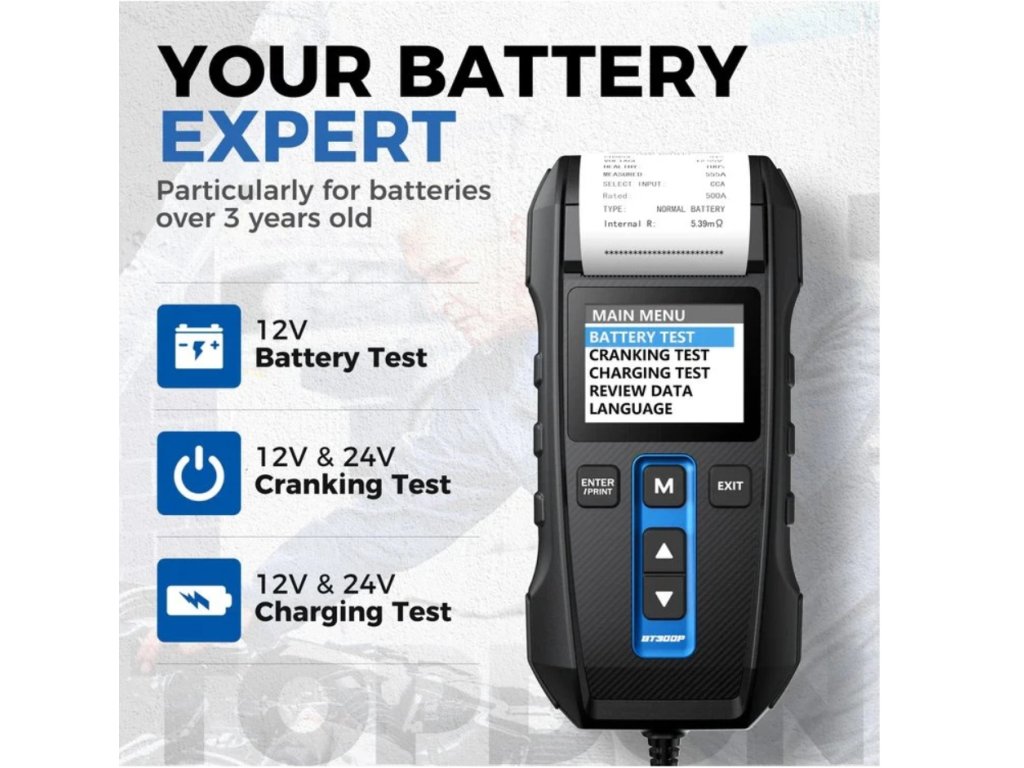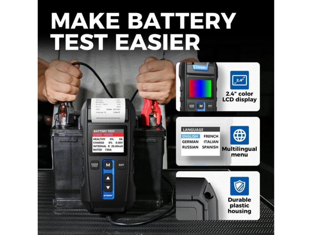 TOPDON® BT300P je 12V tester olovených automobilových batérií so vstavanou tlačiarňou. Dokáže otestovať batérie v rozsahu 100 až 2000 CCA (Cold Cranking Amps). Je kompatibilný s batériami Flooded, AGM, GEL a EFB a podporuje viacero akreditovaných štandardov vrátane CCA, JIS, EN, DIN, SAE a IEC.