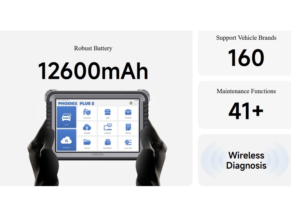 Phoenix Plus 2 poskytuje komplexnú podporu pre viac ako 160 značiek vozidiel a pokrýva kritické systémy, ako je motor, prevodovka a ABS, aby sa zabezpečilo kompletné posúdenie stavu vozidla. Je vybavený najnovším protokolom CAN-FD, umožňuje ultrarýchly prenos údajov a zlepšuje komunikáciu s novšími vozidlami vrátane modelov GM a Chrysler od roku 2020.
