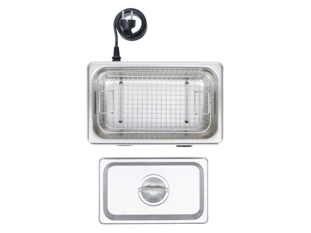 vhodné na čistenie častí motora, nástrojov, šperkov, remienkov na hodinky, elektrických súčiastok, tonerových kaziet, mincí a pod. nerezové puzdro, nádrž, veko a čistiaci kôš veľkosť nádrže: 240 x 140 x 100 mm ultrazvukový výkon: 120 wattov vykurovací výkon: 100 wattov nastavenie času: 0 - 20 min nastavenie teploty: 20 - 80 ° C ultrazvuková frekvencia: 40 KHz
