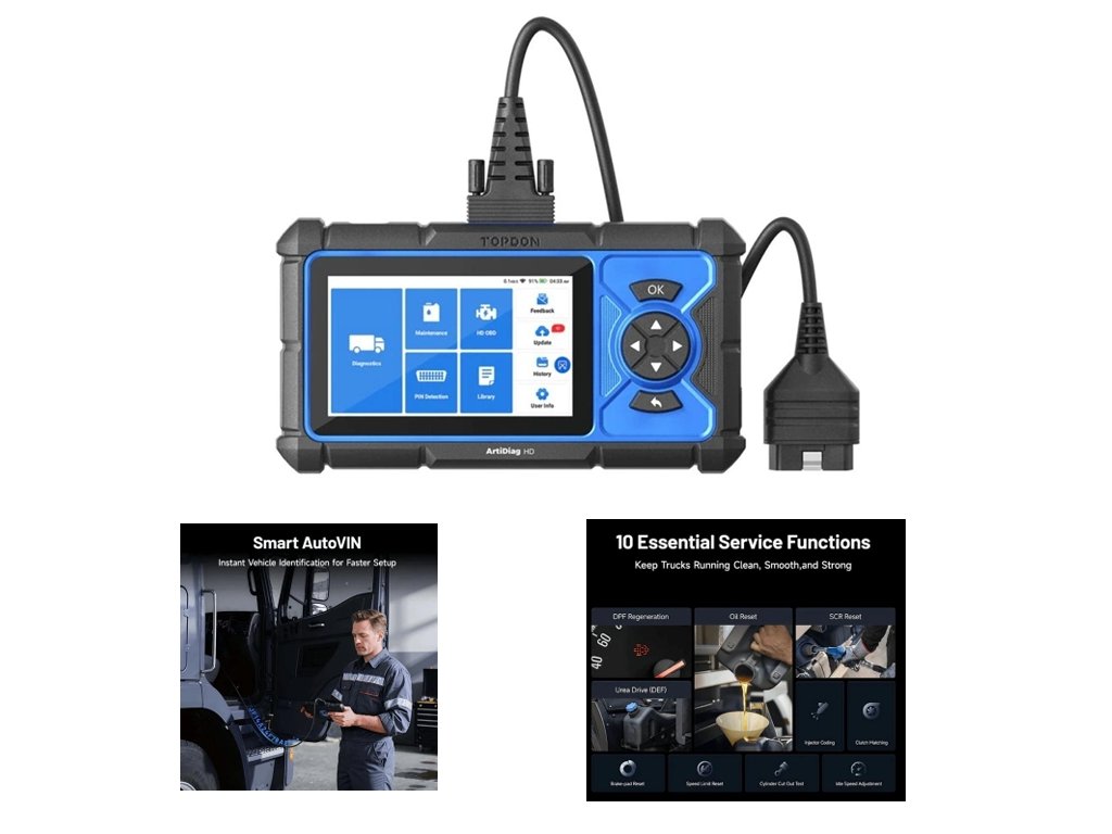 - TOPDON ArtiDiag HD je všestranný diagnostický skener kompatibilní s více než 60 světovými značkami, včetně Benz, Volvo, Freightliner, Kenworth a Caterpillar. Tento jediný a důvěryhodný nástroj efektivně diagnostikuje širokou škálu vozidel, včetně těžkých nákladních vozidel, autobusů a stavebních strojů, což z něj činí nepostradatelnou součást městských vozových parků, logistických center a stavenišť.