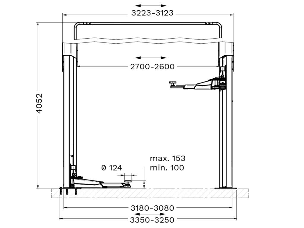 | nosnost: 3200 kg max. výška zdvihu 2000 mm min. / max. podpěrná výška: 2000 mm 96 / 130 mm Šířka průjezdu: 2372 - 2472 mm min. výška stropu: 4150 mm Třídílná asymetrická přední ramena: 555 - 1100 mm 2dílná asymetrická zadní ramena: 805 - 1200 mm max. šířka zdvihu: 3250 - 3350 mm max. výška zdvihu: 4052 mm Výkon: 2x2,6kW |